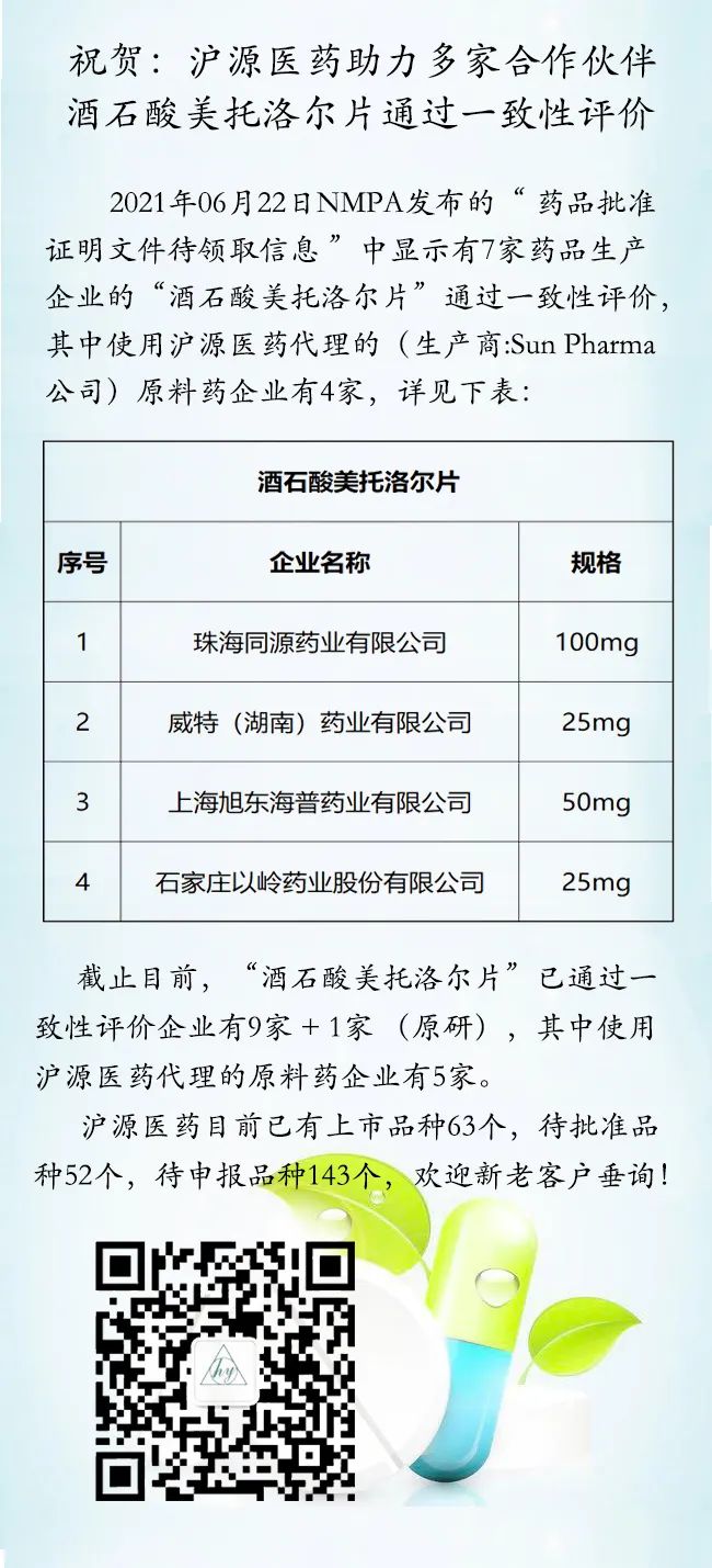 祝賀:滬源醫(yī)藥助力“珠海同源、武漢遠(yuǎn)大、石家莊以嶺、旭東海普、湖南威特”合作伙伴的“酒石酸美托洛爾片”通過一致性評(píng)價(jià)